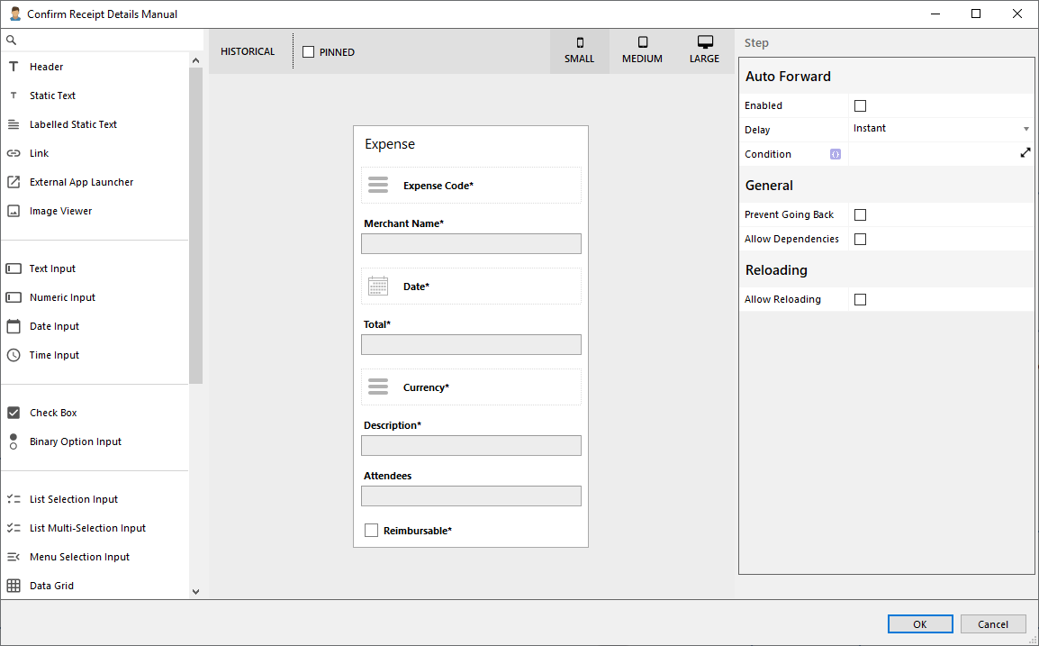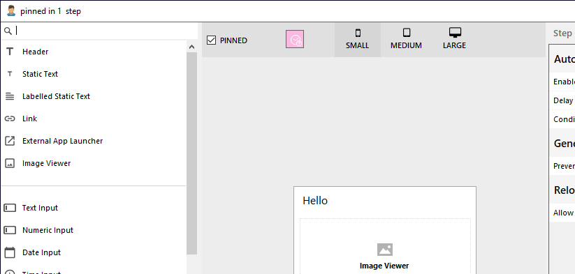 In pinned user steps, only non-editable controls can be used. This limitation exists because a pinned user step is solely intended for displaying information to the user, not to change it.