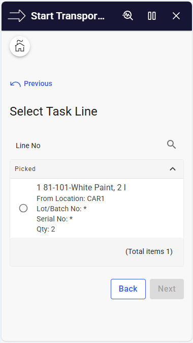 * After a Task Line is processed the flow will loop back to this step to start with another line. This will continue until no lines are left to process for the given Transport Task. However, you can choose to exit the process at any time.