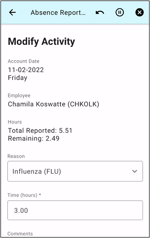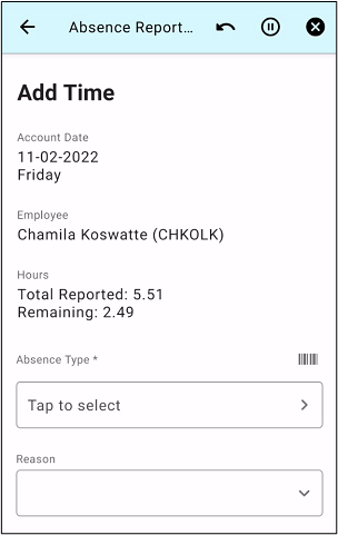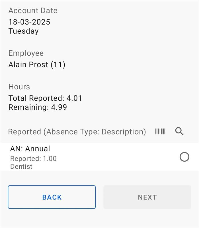 Users can see this screen when there is at least one reported absence of the employee on the account day.