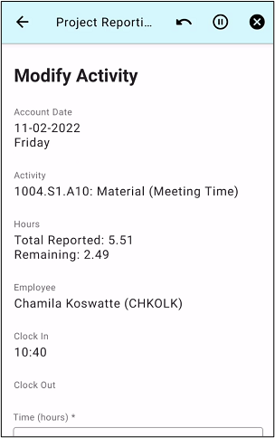 If an existing transaction record was selected, this screen will be shown. This screen contains the base information about the selected day, the project activity of the transaction, the total reported, and remaining hours of the current day, the employee, clock in and out times.