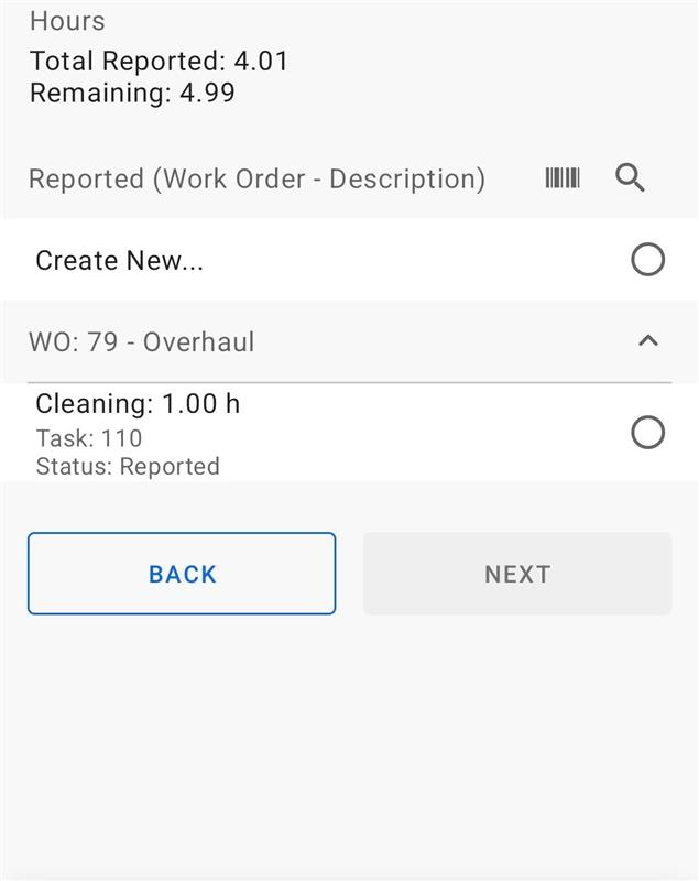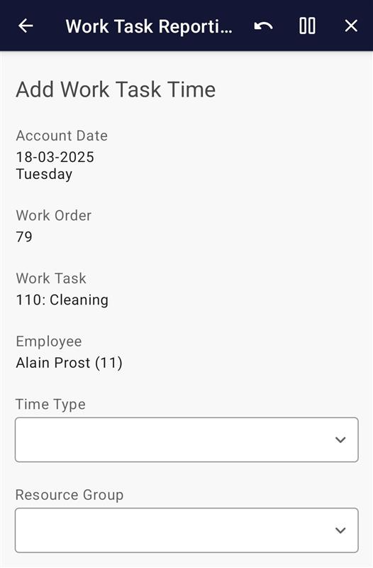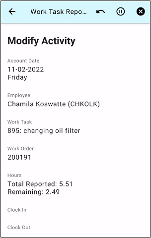 If an existing transaction record was selected, this screen will be shown. This screen contains the base information about the selected day, the employee, the work task, project, total reported, and remaining hours of the current day, and clock in and out times.