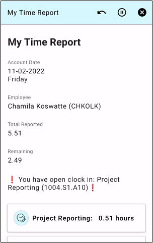 Users can see this screen when there is at least one reported project transaction of the employee on the account day.